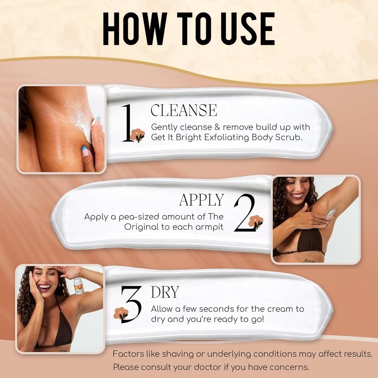 - Apply: Take a pea-sized amount of cream for each underarm.
